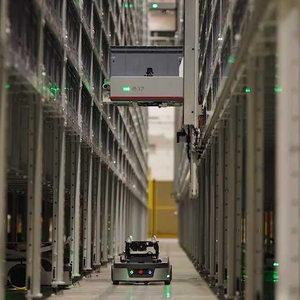 仓库内一排排12米的货架井然有序,货架上忙碌着飞梯机器人,货架下众多的搬运机器人来回穿梭,眼花缭乱却互不干扰。搬运机器人载着料箱平稳丝滑的穿越货架直达出库工作站,完成自动打包后,由输送线运至分拣中心。