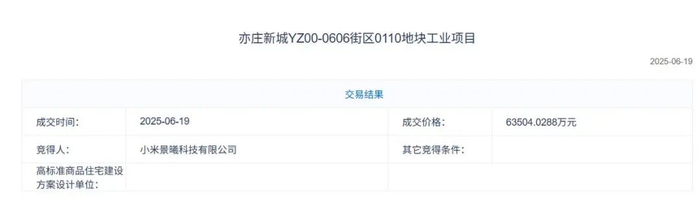 6月19日,据北京市规划和自然资源委员会网站披露,亦庄新城YZ00-0606街区0110地块工业项目以约6.35亿元成交,竞得方为小米景曦科技有限公司,后者由小米智能技术有限公司100%持股。