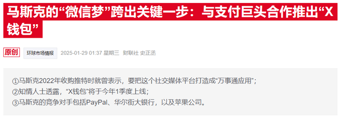 潜在的金融服务扩张呼应了马斯克将X打造成微信那样集通信、支付和购物于一体平台的计划。