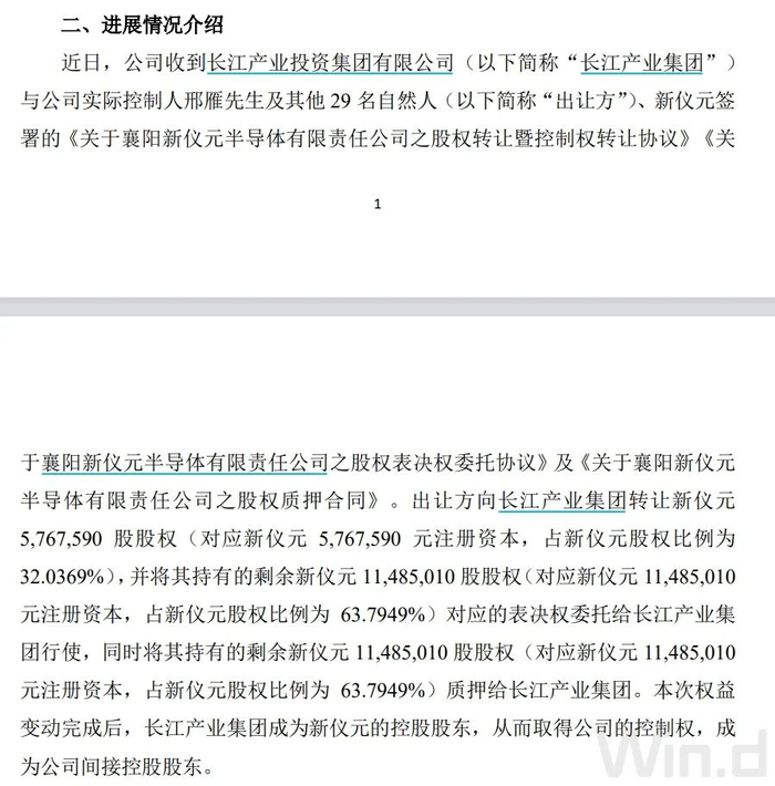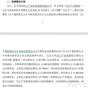 公告称,近日,公司收到长江产业投资集团有限公司(以下简称“长江产业集团”)与公司实际控制人邢雁及其他29名自然人(以下简称“出让方”)、新仪元签署的《关于襄阳新仪元半导体有限责任公司之股权转让暨控制权转让协议》《关于襄阳新仪元半导体有限责任公司之股权表决权委托协议》及《关于襄阳新仪元半导体有限责任公司之股权质押合同》。