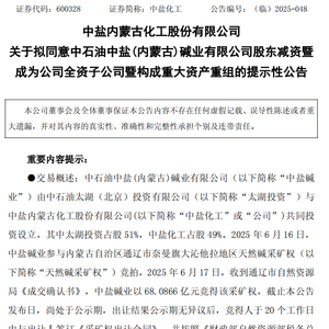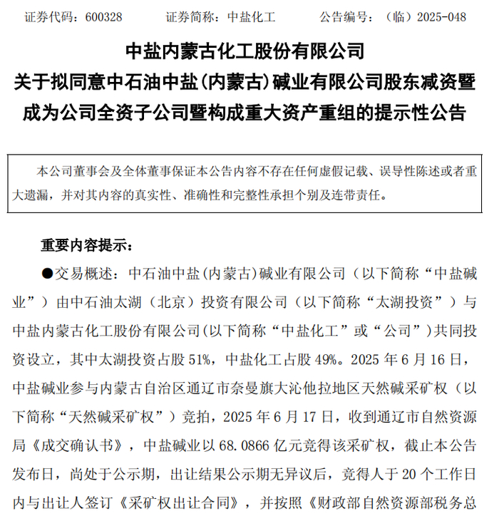 6月19日晚间,中盐内蒙古化工股份有限公司(以下简称中盐化工)发布公告称,公司与中石油太湖(北京)投资有限公司(以下简称太湖投资)以获取内蒙古通辽地区天然碱采矿权为目的,共同出资设立中盐碱业。2025年6月16日,中盐碱业参与内蒙古自治区通辽市奈曼旗大沁他拉地区天然碱采矿权竞拍,6月17日,中盐碱业以68.0866亿元竞得该采矿权,截至本公告发布日,尚处于公示期。