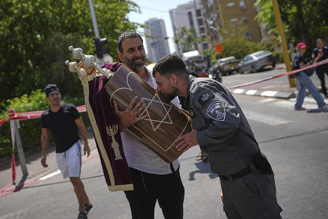 当地时间2025年6月19日,以色列特拉维夫附近霍隆,一枚伊朗发射的导弹击中一座犹太教堂,一名以色列安全部队成员亲吻从受损犹太教堂中取出的《妥拉》卷轴。视觉中国 图