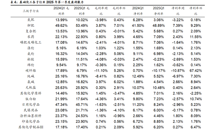 从行业2024年报及2025年一季度来看。2024年,基础化工33个子行业营业收入多数同比增长,其中23个子行业的收入同比实现增长,10个行业收入同比出现下滑。具体来看,改性塑料、轮胎、其他化学原料、锦纶和电子化学品等行业,受益于下游需求的复苏及增长,收入增速相对较快。这些行业2024年营业收入分别增长17.94%、13.51%、12.69%、12.11%和11.34%。碳纤维、钾肥、锂电化学品、纯碱和氯碱行业营收下滑幅度较大,分别同比下滑31.27%、28.56%、25.08%、11.28%和7.69%。