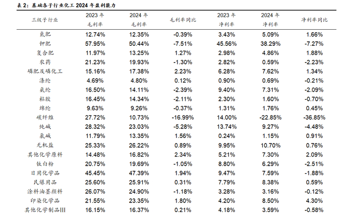 盈利能力方面,2024年基础化工各子行业毛利率出现较大分化。33个子行业中,16个子行业毛利率同比提升, 17个子行业毛利率出现下滑。其中其他化学原料、磷肥及磷化工、氟化工、日用化学品和印染化学品等子行业受供给收缩带动价格上行、成本下行、需求复苏等因素影响,毛利率同比提升幅度较大,分别提升2.34、2.23、2.03、1.94和1.80个百分点;17个子行业毛利率同比下降,其中碳纤维、钾肥、纯碱、氨纶和其他塑料制品等行业,受行业新增产能投放带动景气下行、需求下滑以及产品价格下跌等因素影响,毛利率下滑幅度较大。这些行业前三季度毛利率分别下降16.99、7.51、5.28、2.39和2.17个百分点。