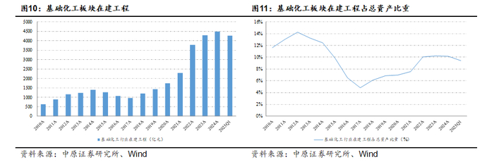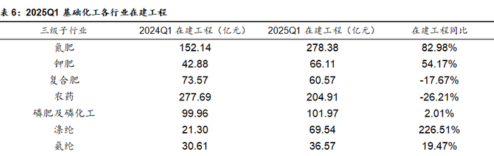 从子行业来看,2025年一季度基础化工各子行业中,15个子行业在建工程同比增长,涤纶、氮肥、锦纶、无机盐、钾肥等行业在建工程同比增幅较大。从绝对规模上看,聚氨酯、锂电化学品、有机硅、其他化学制品、氯碱等行业在建工程规模较大。