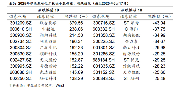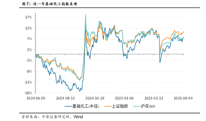 2025年以来,截至6月17日,中信基础化工指数上涨5.22%,跑赢上证综指4.15个百分点,跑输沪深 300 指数6.86个百分点,表现在30个中信一级行业中排名第10位,行业表现强于2024年。