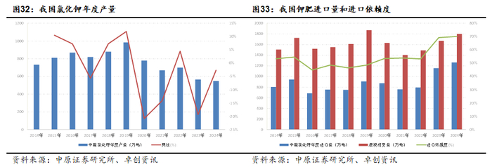 为满足国内钾肥需求,我国钾肥长期以来依赖进口,进口依赖度保持在50%以上。近年来受国内钾肥产量下降影响,我国钾肥进口量提升幅度较大,2023年我国氯化钾进口量1263万吨,进口依赖度超过70%。受限于国内的资源瓶颈,未来我国钾肥资源供应仍将以进口为主。国内钾肥企业布局海外资源,提高国内钾肥资源的保障力度,是钾肥产业的重要发展方向。
