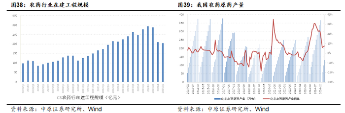 2021年以来,农药行业进入投资的高峰期,行业在建工程规模快速提升。随着2021-2023年连续几年的高强度投资,国内农药行业产能大幅提升,并带了此后的产能过剩。随着行业景气的持续低迷,农药行业投资力度明显减弱,行业供需有望逐步走向平衡。