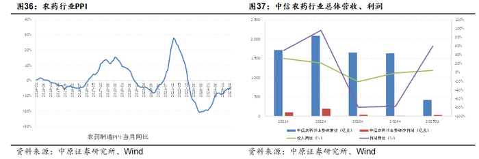 2022年底以来,受行业产能扩张带来供给过剩的影响,农药行业价格总体处于下降通道,行业景气持续下行。受此影响,农药行业盈利亦持续下行。2022-2024年,中信农药行业整体营业收入从2090亿元下滑至1633亿元,整体净利润从192.69亿元下滑至8.87亿元,行业景气低位运行。随着行业景气下行推动落后产能的逐步出清,农药行业去库存周期逐步进入尾声,行业出现边际复苏的迹象。2025年一季度,中信农药行业整体实现营业收入423.95亿元,同比增长4.54%,实现净利润28.67亿元,同比增长60.19%。