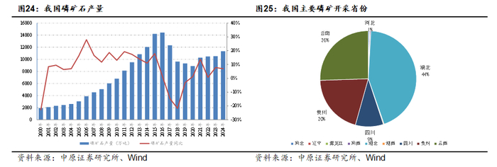 磷矿石在开采,加工过程中均会对环境造成一定污染,其开采过程中会产生的尾矿、废石、废渣、磷石膏等固体废物,长期露天堆放会导致雨水将废弃物中的磷、氟化物、重金属等污染物质渗透入地下土壤和周边的河流水域。由于磷矿中含有较高水平的天然放射性元素,其开采过程中的废水、废渣处置不当还会带来放射性污染。2016年以来,随着长江生态保护上升到国家战略,沿岸省份加大了“三磷”整治力度。由于我国磷矿的主产区云贵川鄂四省均位于长江经济带,磷矿开采领域的环保压力大幅提升,落后产能逐步退出,磷矿石产量开始下滑。2017年我国磷矿石产量1.23亿吨,同比下滑14.6%。2018年-2024年,我国磷矿石产量总体稳定在1亿吨左右。未来随着我国磷矿资源保护力度的提升以及环保政策的持续趋严,磷矿供给端面临较大约束,预计供给将整体保持稳定。