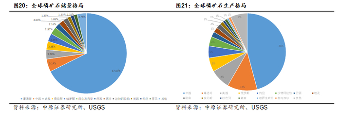 全球磷矿石储量主要集中于摩洛哥、中国、中东以及北美等地。根据 USGS(美国地质勘探局)发布的2025 版《美国地质调查:矿物概要》,2024年全球磷矿石储量740亿吨,其中摩洛哥储量最高500亿吨,约占全球储量的68%,中国储量37亿吨位居全球第二,占全球储量的5%。从产量上看,我国是全球最主要的磷矿石生产国,2024年总产量1.1亿吨,约占全球产量的45.8%。