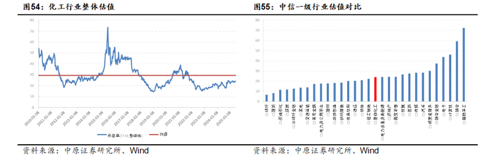 从行业估值情况来看,截止2025年6月17日,中信化工板块TTM市盈率(整体法,剔除负值)为24.09倍。2010年以来,行业估值平均水平为29.36倍,目前估值水平低于历史平均水平。与其他中信一级行业横向对比,化工板块估值在28个行业中位居17位,维持行业“同步大市”的投资评级。