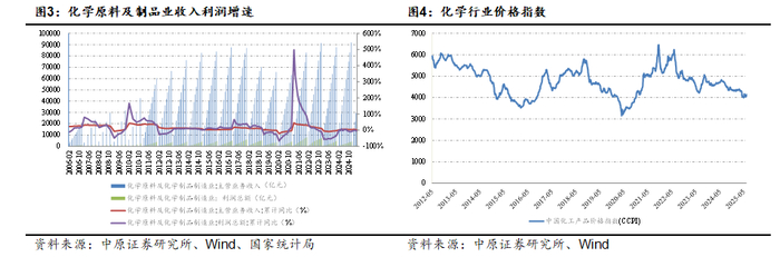 2022 -2023年,在全球经济下行以及行业产能持续扩张等多重压力影响,化工品价格回落幅度较大,行业收入、利润增速进一步下滑,行业景气持续下行。随着下游需求的逐步回升以及行业新增产能投放的放缓,2023年底以来化工行业利润下滑态势逐步放缓,景气逐渐寻底。2025年1-4月,化学原料及化学制品制造业实现营业收入29439.3亿元,同比增长3.1%,实现利润总额1150亿元,同比下滑4.4%,行业景气总体呈现底部运行态势。