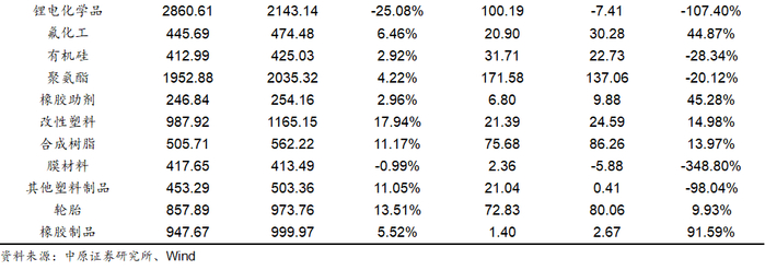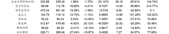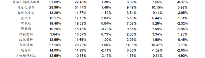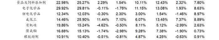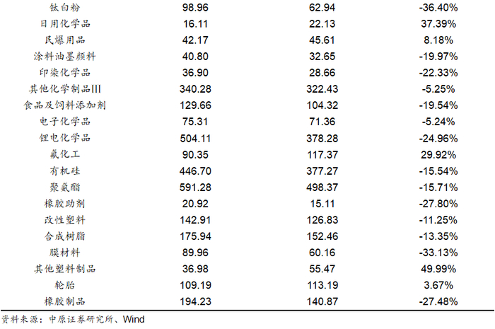 净利润方面,基础化工各子行业净利润表现出现较大分化。33个子行业中有17个子行业净利润实现增长,16个子行业净利润同比下滑。其中氯碱、印染化学品、橡胶制品、复合肥、其他化学原料行业净利润表现较好,分别同比增长160.64%、110.55%、91.59%、65.25%和57.06%,膜材料、碳纤维、锂电化学品、其他塑料制品和农药行业净利润下滑幅度较大,分别同比下滑348.80%、212.45%、107.40%、98.04%和77.61%。净利润增长的行业中,氯碱、橡胶制品、复合肥等行业主要受益于下游需求恢复以及行业供需格局的优化。此外碳纤维、锂电化学品等产业受行业产能快速扩张,行业竞争加剧等因素影响,利润下滑幅度较大。