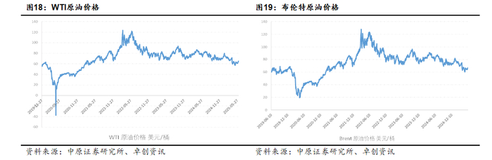 从供需来看,二季度以来国际原油供需开始走弱。供给面,4月OPEC+宣布于5月增产41.1万桶/日,标志着OPEC+自2022年实施减产政策以来的显著转向。5月份的OPEC+会议延续了增产的步伐,将6月产量增加41.1万桶,与5月增产规模持平。未来看OPEC+的增产将对原油供给带来一定压力,但考虑到近年来全球油气巨头资本开支处于低位,原油供给增量有限,叠加地缘政治的不确定性,对油价带来一定的支撑。需求面,根据三大机构预测,2025年全球原油需求预计较2024年小幅增长74-130万桶/天,需求面亦较为疲弱。预计未来油价下行空间有限,总体维持中油价区间运行的状态。