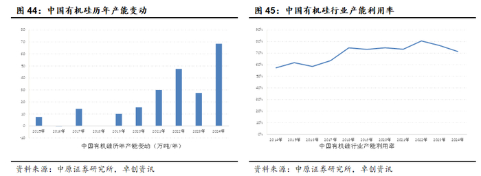 2020年以来,受新能源等下游需求拉动,有机硅行业景气和盈利显著提升,推动我国有机硅产能迎来一轮扩产周期。在此期间,我国有机硅中间体产能扩张幅度较大,规模快速提升。根据卓创资讯数据,我国有机硅中间体产能从2019年的164万吨/年增长至2024年的353万吨/年,提升幅度达115.24%,其中2024年为有机硅产能投产大年,当年产能增长68.5万吨,增长幅度达24.08%。受产能快速提升的影响,2024年我国有机硅行业产能利用率下降至71.43%,位于2018年以来的低位。