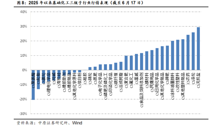 从子行业来看,2025年以来,33个中信三级子行业中,23个子行业上涨,10个子行业下跌,其中无机盐、涤纶和农药行业表现居前,分别上涨29.44%、25.89%和24.21%,聚氨酯、轮胎和氨纶行业表现居后,分别下跌20.43%、13.08%及9.13%。