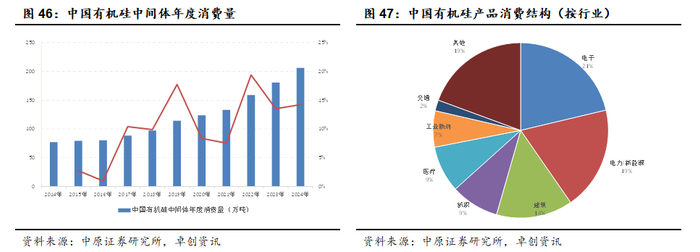 需求面来看,在电子、电力新能源等领域需求的带动下,我国有机硅需求量保持了快速增长。2014-2024年,我国有机硅中间体需求量自77.2万吨增长 206.05万吨,年复合增长率11.53%。未来随着新能源、光伏、电子电气等新兴领域的快速发展,我国有机硅需求量有望保持较快增长态势。