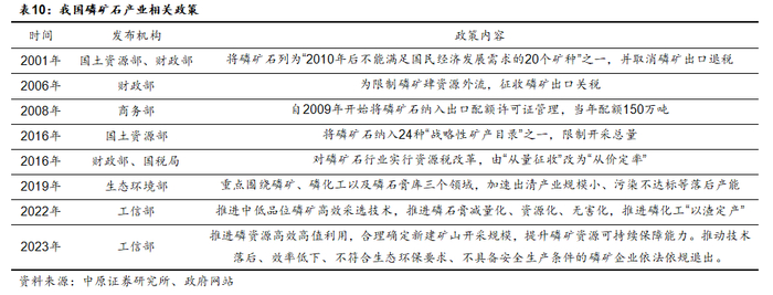 2016年开始,国土资源部将磷矿石纳入24种“战略性矿产目录”之一,磷矿已经成为我国重要的战略性资源。同时财政部对磷矿实行资源税改革,从而提高中低品位磷矿的开采利用,降低磷矿石的资源浪费,推动行业的整合。生态环境部、工信部等部门也出台各种措施,加大磷矿开采的环保整治力度,提高磷矿的资源利用率,推动中小产能的出清。