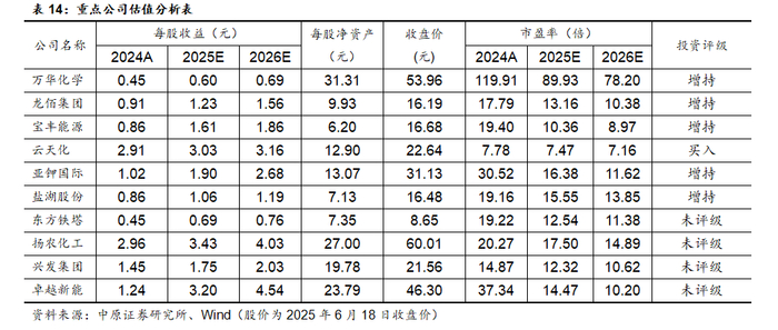 维持行业“同步大市”的投资评级。投资策略上建议关注万华化学、龙佰集团、宝丰能源等一体化龙头企业和磷化工、钾肥、农药等农化板块以及有机硅、化工新材料、生物柴油等行业的投资机会。