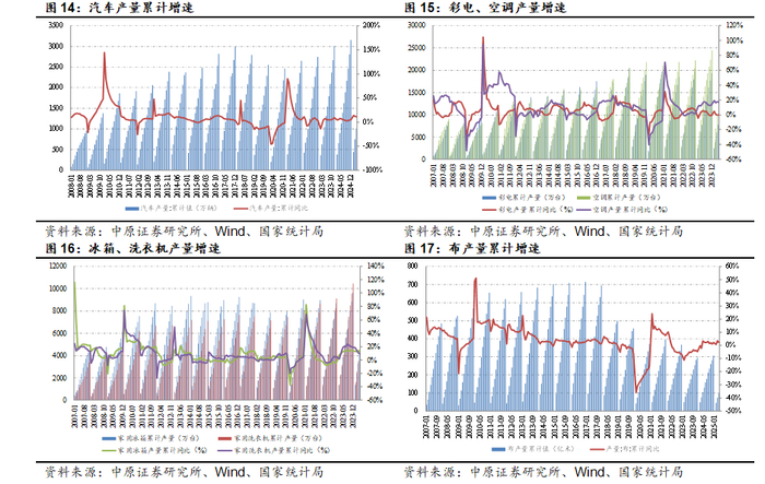 家电方面,2024年我国彩电产量2.07亿台,同比增长4.60%;空调产量2.66亿台,同比增长9.70 %;冰箱产量1.04亿台,同比增长8.30%;洗衣机产量1.17亿台,同比增8.80%,延续了较快增长态势。2025年1-4月,我国彩电产量5966.6万台,同比下滑3.90%,空调产量1.05亿台,同比增长7.20%,家用冰箱产量3220.4万台,同比下滑0.70%,洗衣机产量3918.8万台,同比增长10.90%。总体上看,主要家电产量保持较好势头。纺织服装方面,2024年我国布产量306.33亿米,同比增长2.20%,纱产量22377.90万吨,同比增长1.30%,结束了连续2年的下滑态势。2025年1-4月,我国布产量101.2亿米,同比增长2.30%,纱产量754.5万吨,同比增长7.0%,纺织服装领域需求延续复苏态势。总体来看,化工各领域的需求有一定回暖。