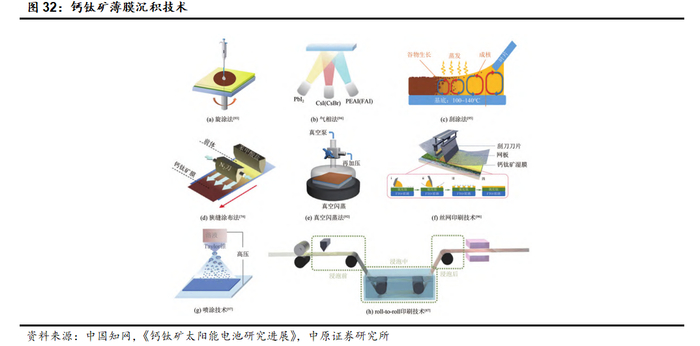 大面积制备钙钛矿吸光层被逐步突破。大面积钙钛矿薄膜沉积技术主要包括旋涂法、刮涂/狭缝涂布技术、roll-to-roll印刷技术、喷墨打印技术、丝网印刷技术、气相沉积技术及真空闪蒸技术等。