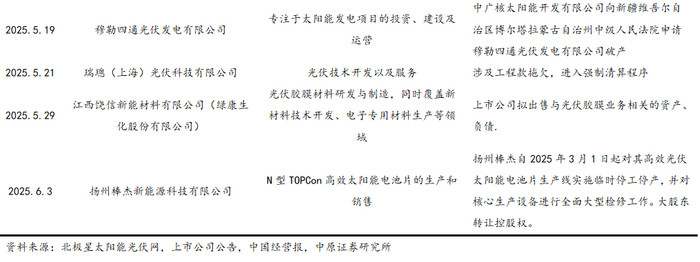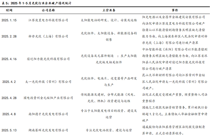 2025年上半年,无技术和资金实力弱的小型厂商陆续破产。2025年1-5月根据不完全统计,11家中小光伏产品制造商或光伏电站相继申请破产清算,涉及太阳能电池、光伏组件、胶膜、电站等多个环节。破产原因多为供应商欠款拖欠,债务违约,现金流断裂。光伏小企业破产是 “产能过剩+技术迭代+债务杠杆”三重挤压的结果。短期光伏产品价格低迷,中小企业将持续被清退出市场,后续不排除部分高杠杆大型光伏企业破产。而长期具备技术壁垒、 资金实力、成本优势企业穿越周期,享受集中度提高和市场扩大的红利。