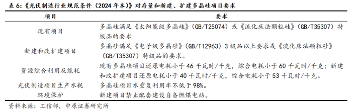 另一方面,新建多晶硅项目生产标准较为苛刻。根据2024年11月20日工信部对外发布修订后的《光伏制造行业规范条件(2024年本)》。对于多晶硅制造领域,行业规范条件在电耗、水耗、产品质量方面对现有项目和新建项目进行约束。新的行业标准将显著提高多晶硅项目投资门槛,抑制低端产能盲目扩张。