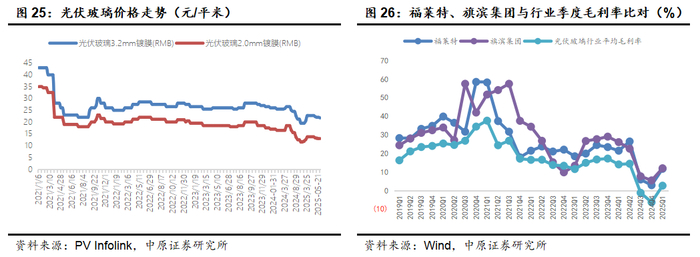 光伏玻璃价格将回落后修复。2024年,随着下游应用端对双面发电组件发电增益的认可,双面组件市场占比提升至77.6%,成为市场主流。与之同时,2.0mm的光伏玻璃市场占有率提升至75.8%,延续薄片化趋势。根据国际可再生能源机构(IRENA)发布的《2025年可再生能源容量统计数据》显示,2024年全球太阳能光伏新增装机容量为451.9GW,对应的光伏玻璃原片理论需求近3937万吨,折合日熔量10.78万吨/日。2025年,尽管全球新增光伏装机速度趋于放缓,但光伏玻璃初步调整后的行业供给几乎贴近理论需求。光伏玻璃价格经过抢装后再次回落,值得一提的是,纯碱价格显著下行缓解部分产品价格下滑压力。考虑到头部光伏玻璃企业几无盈利,二三线企业大幅亏损的行业严峻形势,头部企业出于控量保价的收缩供给动作,预计行业玻璃产品价格回落幅度有限,行业毛利率将企稳修复。