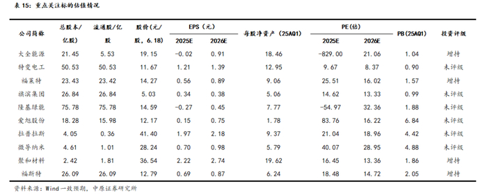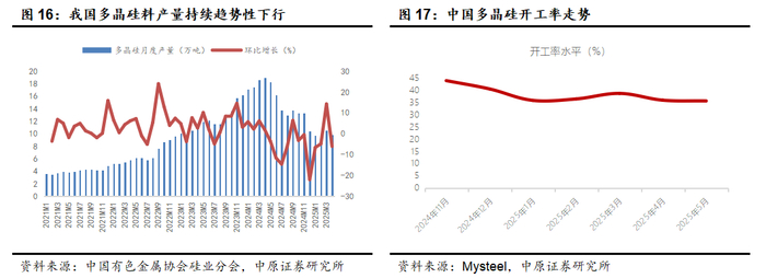 多晶硅:面临多晶硅严重产能过剩,行业过度内卷的局面,监管层首先从项目审批源头予以控制,多晶硅新建项目审批权限从省级部门上收至国家发改委,同时,新建多晶硅项目生产标准较为苛刻,提高行业准入门槛。硅料价格持续跌破现金成本,企业均持续失血,头部企业均已大规模减产,行业自律以及后续潜在的并购整合将推进,行业将逐步触底。目前多晶硅行业处于周期低位,行业反转尚待更多积极因素推动。建议中期关注具备规模优势、成本优势和资金优势的头部多晶硅料厂。
