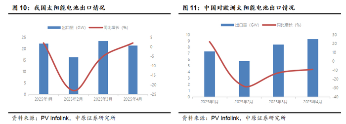 中国对海外市场的出口光伏组件疲软,下半年预期难有显著改观。由于中国的光伏产品占据全球的绝大部分供应量,从出口情况可以判断出海外的需求变化。根据PV infolink的统计,2025年1-4月,我国光伏组件出口量83.29GW ,同比减少6%。具体分布来看:对欧洲出口规模30.92GW(yoy -9%),亚太市场出口30.6GW(yoy 2%),美洲市场10.2GW,(yoy -10%),中东出口7.18GW(yoy -29%),非洲出口4.39GW(46%)。海外市场光伏需求增速呈放缓趋势。下半年展望: