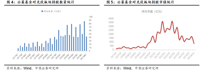2025Q1基金对光伏板块持仓市值创本轮周期以来新低。根据Wind统计,截至2025年一季度末,基金披露的重仓持股中对光伏公司合计持股数量42.28亿股,较2024年末下滑51.54%;合计持仓市值791.8亿元,2024年末下滑52.94%。基金对光伏股票持仓亦呈现高度集中的特点,主要集中在光伏逆变器、多晶硅料、一体化组件厂、光伏胶膜和硅片头部企业。前十名持仓市值618.34亿元,比例78.09%。机构持仓市值排名前十名的公司分别为:阳光电源、隆基绿能、德业股份、通威股份、晶科能源、晶澳科技、特变电工、天合光能、福斯特和TCL中环。