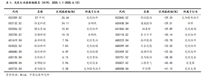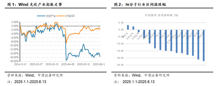 弱基本面背景下反弹无力,个股均低位反复震荡。2025年上半年,光伏板块表现弱于大市,截至6月13日,光伏产业指数期间收益率-15.60%,继续大幅跑输市场。光伏行业所属的中信一级行业电力设备及新能源期间涨幅-5.77%,在中信一级行业中排名第25名。