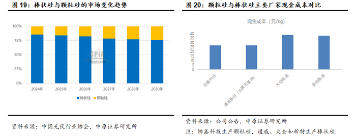 颗粒硅具有能耗优势,市场份额有望提升。多晶硅生产的主流技术主要包括三氯氢硅法和硅烷流化床法,产品分别为棒状硅和颗粒硅。得益于棒状硅技术成熟、产品杂质量低、工艺稳定,客户群体广泛,主要多晶硅厂家均采用改良西门子法生产多晶硅。根据中国光伏行业协会的数据,2024年棒状硅市场占比为85.6%,颗粒硅占14.4% 。目前企业使用颗粒硅掺杂生产多晶硅。颗粒硅具备能耗优势(低温连续反应(硅烷分解温度低)和高单程转化率),综合电耗仅20度电/公斤左右,相对于棒状硅节约70%。颗粒硅工艺设备简化、自动化程度高支持CCZ连续投料,具备更高的降本潜力。但另一方面,由于颗粒硅比表面积大易吸附杂质(氢、碳含量偏高),硅烷气体易燃易爆存在安全隐患。预计随着颗粒硅生产过程中的杂质控制水平提高和技术的稳定,颗粒硅的市场占比有望继续提升。