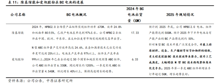 2024年,隆基绿能和爱旭股份BC电池出货量分别达到17GW和6.33GW,分别同比增长1.91倍和12倍。2025年,隆基绿能继续优化产能结构,推动HPBC电池的产能建设和迭代,预计到年底BC电池和组件产能达50GW,BC产品出货占比提升至50%。2025年,爱旭股份将持续开展 N 型 ABC技术的提效工作,通过满屏技术升级、半片钝化工艺、光学工程创新等途径进一步提升光电转换效率,通过产能效率优化提升、创新降本物料导入、能耗水平优化等多种手段,降低成本。同时,爱旭股份推进现有PERC和TOPCon电池产能的升级改造工作,实现向N型BC电池产能的平稳过渡。2025年第一季度爱旭股份ABC组件新增在手订单超过5GW,呈现快速增长态势。