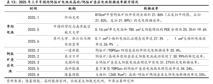 2025年钙钛矿及叠层电池的效率与稳定性均有提高。从效率来看,晶硅电池理论极限转换效率为29.43%,而单结和双叠层钙钛矿电池理论转换效率分别为33%和44.3%,远高于晶硅电池的理论转换效率。2025年上半年,国内的科研院所、高校与企业在单结钙钛矿电池和晶硅/钙钛矿叠层电池转换效率方面均取得较大进步。其中,传统太阳能电池企业在晶硅电池领域有着深厚的技术和工艺积累,偏向于与钙钛矿叠层电池进行叠层,并逐步从小面积向大面积商业化应用推进。隆基绿能在大面积(260.9cm²)晶硅-钙钛矿两端叠层太阳电池转换效率达33%,刷新行业记录。