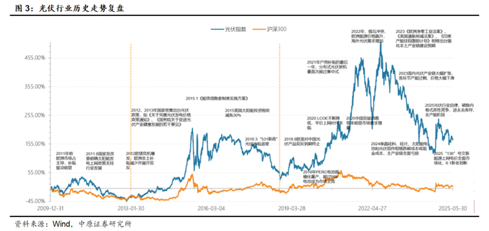 从过往三轮光伏行情来看,除了受整体市场牛熊因素外,国际贸易政策、技术进步、补贴政策以及清洁能源转型政策对行业供需形成显著影响,叠加资金的进出,进而放大二级市场波动。截止到2025年6月中旬,光伏指数本轮周期从高位下跌超过50%,部分产业链环节或个股最大跌幅超过75%。光伏产业指数自2024年9月24日本轮反弹后再次回落前期低位附近。