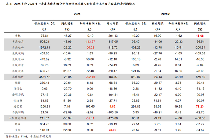 主产业链大幅亏损,细分领域子领域全面承压。细分子行业方面,2024年,除光伏逆变器和支架外,其他领域归属于上市公司股东的净利润均同比负增长,尤其是光伏四大主材产生大额亏损。主材环节过剩力度较大,竞争尤为激烈。2025年第一季度,仅光伏背板和光伏逆变器净利润同比增长,而四大主材环节延续亏损状态。供给过剩的局面短期未发生根本改变,叠加关税政策的不确定性、海外自建产业链、欧洲等老牌市场需求疲软、中国抢装结束后需求回落等影响,短期光伏行业盈利继续承压,部分市场集中度较高环节如银浆、胶膜、光伏玻璃、多晶硅料有望加速中小产能淘汰。