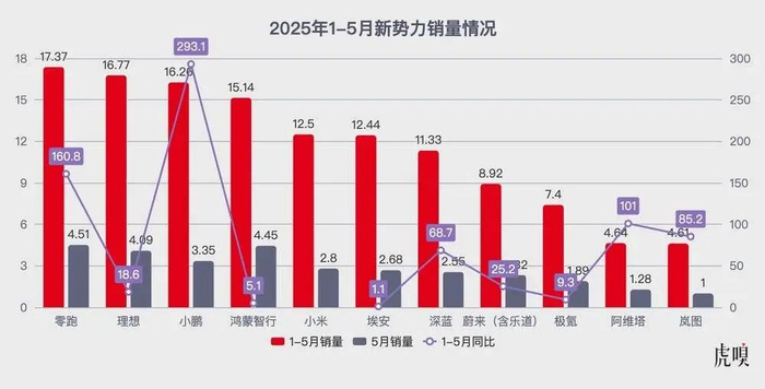 在所有造车新势力中,今年1-5月依旧保持高速增长的只有两家:小鹏和零跑。