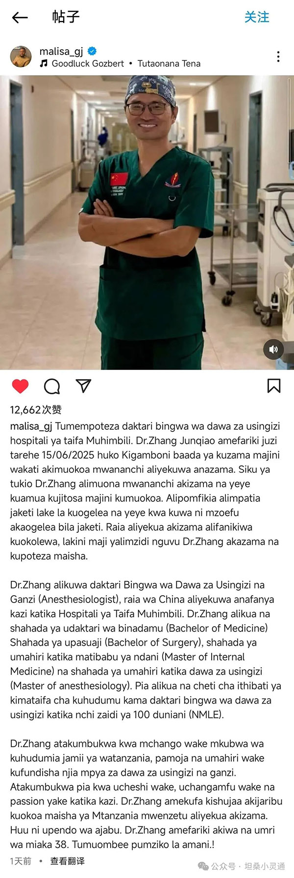 微信公众号“坦桑小灵通”写道,张医生的离世,在坦桑尼亚社会引发强烈反响。拥有逾73万粉丝的知名公益人士Godlisten Malisa(Instagram账号:@malisa_gj)在社交平台发文悼念,详细讲述了张医生舍己救人的英勇事迹,并写道:“张医生用生命托起了一位坦桑尼亚民众,也托起了中坦之间最珍贵的友谊。”Malisa的发声迅速引发广大网民的共鸣,众多网友留言缅怀,称他是“最值得尊敬的中国医生”。