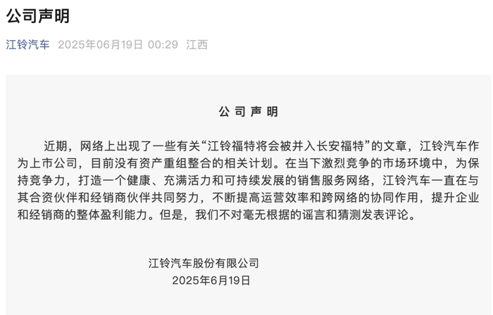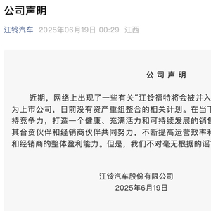 6月18日,江铃汽车发布声明回应:近期,网络上出现了一些有关“江铃福特将会被并入长安福特”的文章,江铃汽车作为上市公司,目前没有资产重组整合的相关计划。江铃汽车表示,在当下激烈竞争的市场环境中,为保持竞争力,打造一个健康、充满活力和可持续发展的销售服务网络,江铃汽车一直在与其合资伙伴和经销商伙伴共同努力,不断提高运营效率和跨网络的协同作用,提升企业和经销商的整体盈利能力。但是,我们不对毫无根据的谣言和猜测发表评论。