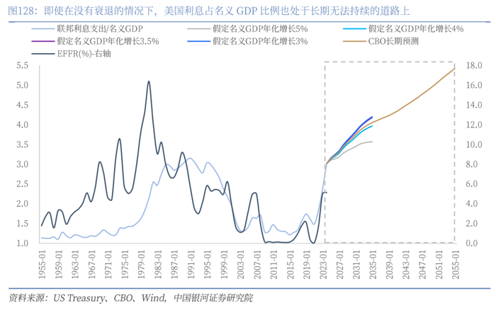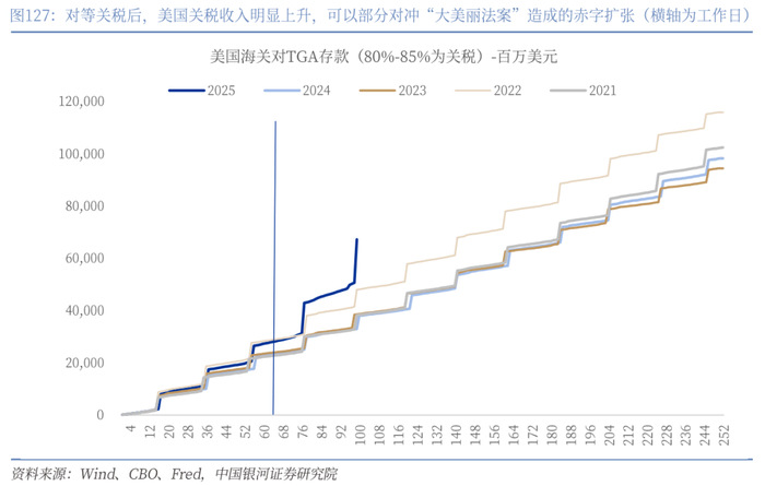 虽然大美丽法案目前尚未成为正式立法,但其现行的财政扩张框架基本意味着特朗普任期内缩减赤字的计划正式“破产”,而赤字上行的幅度则可能取决于关税收入的力度,目前预测特朗普任期内赤字虽然偏高但仍能控制在7%以内。从当前的版本来看,形成赤字的主要项目包括:(1)延长2017并永久化2017减税法案,并在此基础上增加部分减税和支出,10年共计约4.8万亿美元;(2)增加1440亿美元国防相关支出;(3)希望拨款新雇佣至少1万名移民与海关执法局人员,期望每年驱逐100万非法移民,预计增加670亿美元支出;(4)5510亿美元利息支出。而减少赤字的项目主要包括:(1)废除绿色能源和生产相关补贴,增加部分新税收,预计缓解1.1万亿美元;(2)削减医疗方面Medicaid的相关成本,预计缓解8900亿美元;(3)其他能源、教育等相关补助的削减。综合来看,该法案预计在未来10年内增加大约3万亿美元的赤字,美国国会预算办公室(CBO)和负责任预算委员会(CRFB)等机构的测算赤字规模基本一致;而如果考虑到当前减税法案进一步永久化,则长期赤字可能增加5万亿美元。仍需要注意的是,赤字规模在十年内的分布并不均匀,而是“减税前置、节流后置”,因此净赤字方面2026、2027和2028年可能分别上升4790亿、5970亿和5620亿美元,明显高于均值。