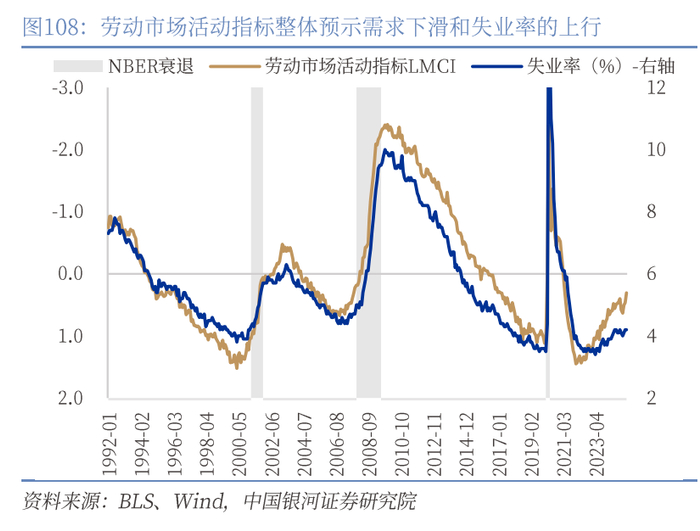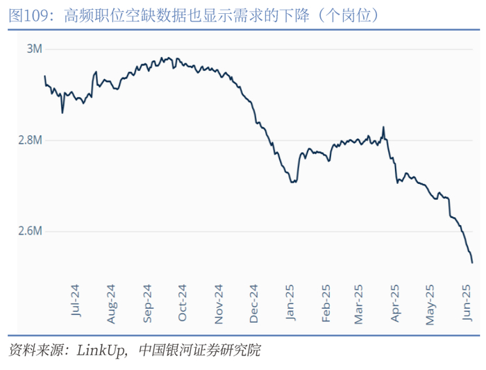 第三,从需求端的数据来看,劳动需求整体保持稳定弱化的状态,硬数据和软数据都有走弱。硬数据方面,美国职位空缺数整体保持下行态势,空缺率降至4.5%下方,招聘指数也基本预示着空缺数持续的温和下行;LinkUp的万家大企业职位空缺数也从关税加征前270万个的水平快速降至255万以下,硬数据基本都在预示需求将进一步下行。软数据方面,ISM非制造业PMI的新订单指数显著下行并进入萎缩区间、NFIB小企业空缺和雇佣预期下滑等数据也在显示需求趋弱;从综合指数考虑,堪萨斯联储的劳动市场活动和动量指数基本指向劳动市场的进一步恶化,咨商会的就业趋势指数持续下滑,联储同步就业指数也进入接近历史衰退水平的增速[1]。总体上,需求端在2025下半年预计保持逐步弱化。