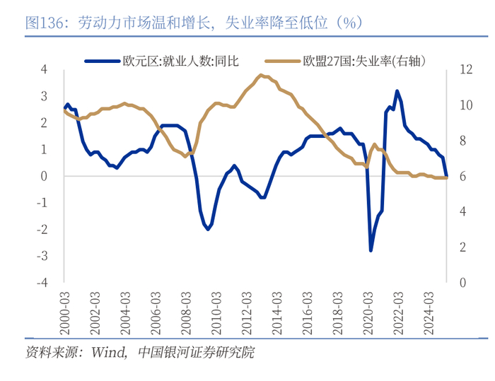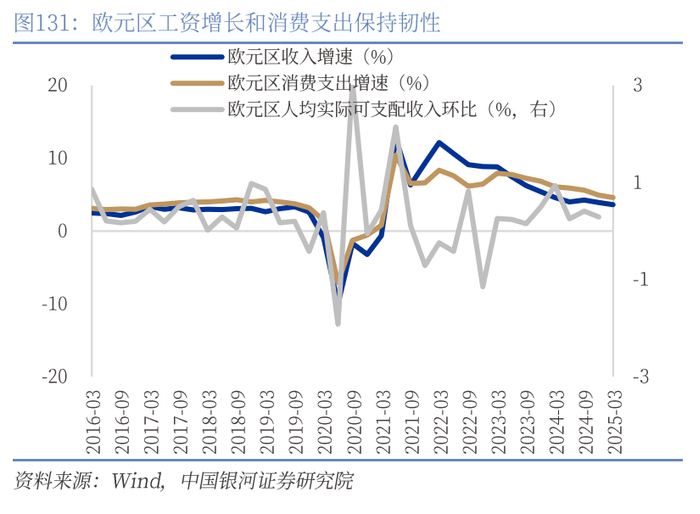 劳动力市场和私人消费仍表现出较强的韧性,但下半年对经济的推动作用可能趋弱。劳动力市场延续了2024年以来的温和扩张态势,尽管2024年第四季度就业增长较为平稳,但2025年第一季度就业人数环比有所上升。欧央行预计,2025年就业增长率将从2024年的1.0%下降至0.5%至0.6%左右。同时,欧元区的失业率预计将缓慢下降,达到历史低位。虽然名义工资增长有所放缓,但就业持续增长、通胀回落,推动家庭可支配收入进一步提升,从而为私人消费提供支撑。然而,3月和4月消费者信心的下降表明,消费可能会受到预防性储蓄动机的抑制,影响消费支出的扩张。