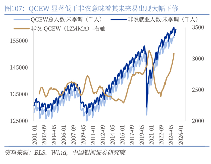 其次,预计非农就业总数在今年8月根据季度就业和薪资普查(QCEW)模型调整时仍会继续显著下修,可能导致一季度的新增就业数量低于10万岗位/月。从近期公布的QCEW数据来看,2024年底,QCEW统计就业为1.562亿个岗位,而非农则为1.599亿个,相差372余万个,较2024年3月277万个的差值继续显著扩大。2024年8月根据QCEW对2023年4月至2024年2月的非农数据进行了81.8万的下修;以目前的差值推算,2025年8月修正时下调幅度应超过90万个岗位,对应每月额外下调7.5万个。这可能导致2025年Q1的月均新增非农就业从11.1万降低至3.6万,而这一水平除了表明劳动市场放缓外也将进一步推升失业率。