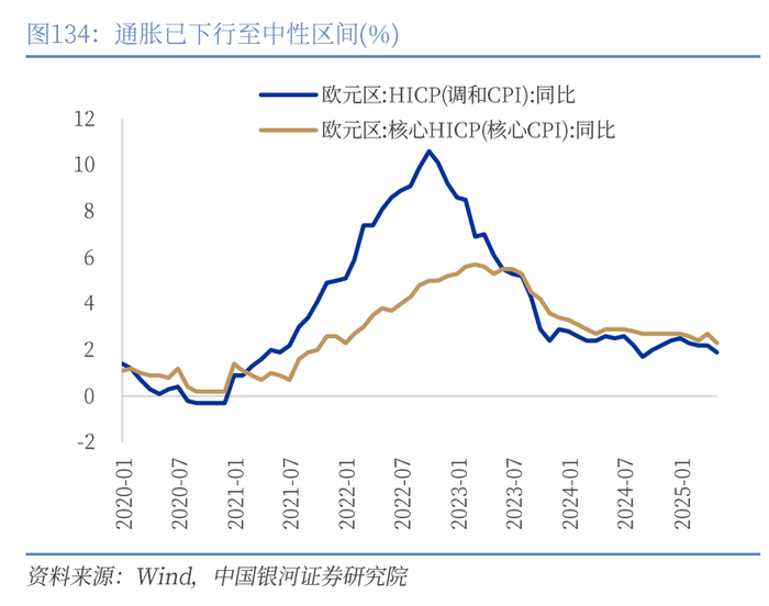 欧元区通胀已下降至中性区间,下半年或进一步下行。2025年以来,欧元区通胀持续降温,5月的HICP初值为1.9%,为八个月来首次低于欧央行2%目标水平;5月核心HICP为2.3%,也低于欧央行预期的2.4%。名义工资增长的放缓、能源价格的下降、和服务业价格涨幅的大幅放缓和欧元走强是欧元区通胀下降超预期的主要原因。食品通胀的降温和劳动力成本压力的缓解使得2025年下半年欧元区通胀进一步下行。