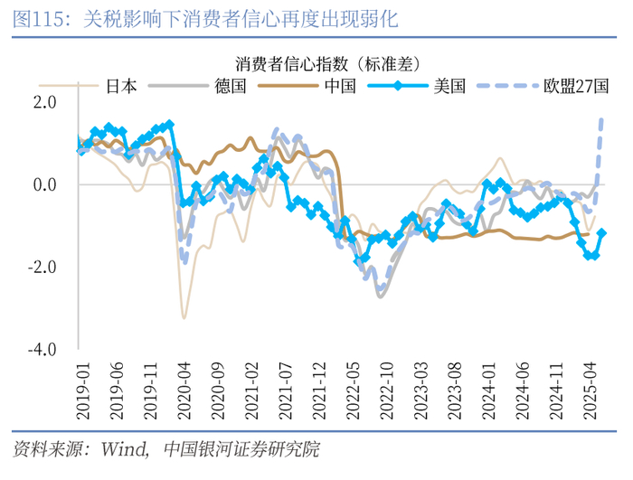 虽然消费整体无虞,但依然需要注意导致其下行的力量。在可支配收入整体稳定的情况下,居民储蓄率却从3.5%左右的低位出现了持续的上行,4月已经达到4.9%,这意味着在经济不确定性和通胀上行的情况下,即使收入平稳,用于消费的比例却在边际降低,可能导致实际消费支出的下滑。其次,美国的消费软数据较为疲软,消费者信心处于低位也可能预示下半年消费的进一步走低。此外,居民的超额储蓄名义值也已经进入负值,这意味着居民主要用于消费的收入来源就是薪资和政府转移支付,如果下半年劳动市场进一步走弱,则并无额外的储蓄阻止消费走低。最后,2025年一季度美国私人部门总财富从前值168.1万亿美元降低至166.5万亿美元,权益资产和房产价值都做出了负向贡献,且2025年权益资产和房价延续大幅上涨的概率并不高。财富效应的消退一般也意味着居民消费倾向和能力的降低,因此需要警惕,2025下半年美国实际个人消费支出依然有温和下滑的空间,虽不至于衰退但可能拖累经济增速降至2%以下。