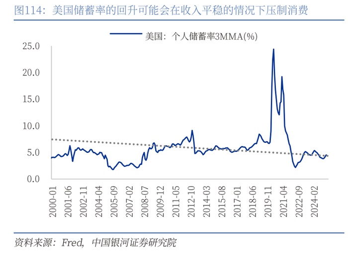 消费方面,美国居民的“薪资-消费”循环短期保持良好但未来可能边际走弱,赤字率通过转移支付对可支配收入的支撑尚在,消费信贷也没有显著的问题,这都利于消费继续使经济保持1.5%以上的增长。不过,需要注意的问题包括服务消费和消费者信心出现弱化,居民储蓄率在不确定性之下开始回升以及超额储蓄为负的情况下财富效应的退坡。