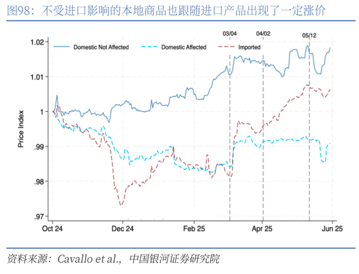 首先,虽然二季度的CPI和PCE通胀数据仍位于2.5%下方,但从高频的价格数据研究来看,美国部分进口商品价格已经出现了明显的上行,并带动了本土产品的涨价;因此,滞后的CPI和PCE通胀数据在下半年仍会出现涨价。短期,通胀数据中的价格上行并不明显,除了居住成本的持续放缓外,商品价格由于轮动抽样统计的滞后和部分相对低价的库存也未明显上涨。不过,从Cavallo等利用美国大型零售商日度线上商品价格数据的研究来看,进口商品的涨价已经发生:(1)从中国进口的商品自3月开始涨价明显,月均近一个百分点,同时5-12谈判后价格也尚未回落;(2)加拿大进口的商品也出现了整体涨价的情况,涨幅弱于中国商品,而墨西哥商品价格则在3月短暂上行后保持低位;(3)美国本土不受进口价格影响的替代品也跟随其竞品上调了价格。考虑到中、加、墨占美国总商品进口约40%,已经出现的温和涨价后续大概率会被CPI等指标捕捉到,尽管价格数据更明显的上行可能要等到三季度。