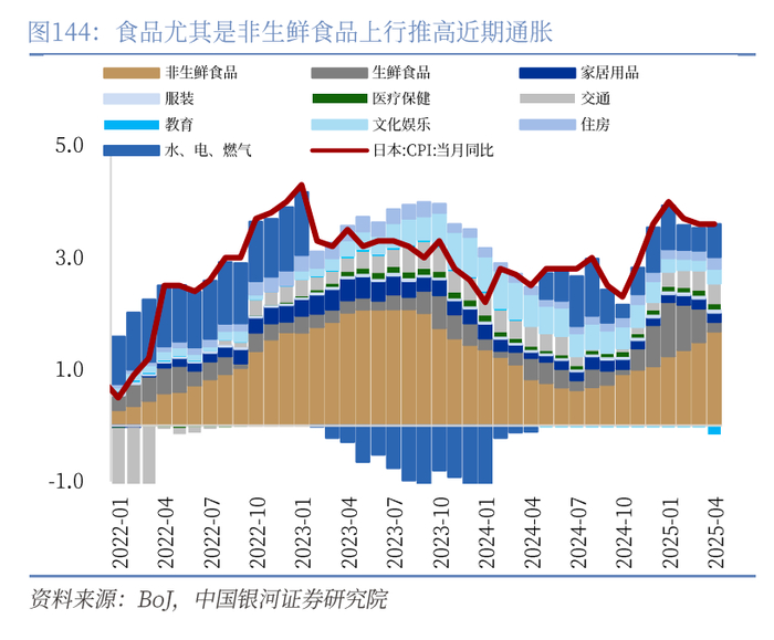 在海外关税冲击和国内需求疲软的背景下,日本经济在2025年后出现了放缓的迹象。数据显示,2025年一季度日本GDP环比萎缩0.2%,其中净出口拖累0.8个百分点。日本正面临美国一连串关税的冲击,其中包括对其商品征收的10%的全面关税,如果最终未达成协议,该关税将于7月初升至24%。国内方面,尽管名义工资增速较快,但持续的通胀以使得2025年以来日本的实际工资转负,食品价格的上涨使得家庭部门消费支出趋于谨慎。